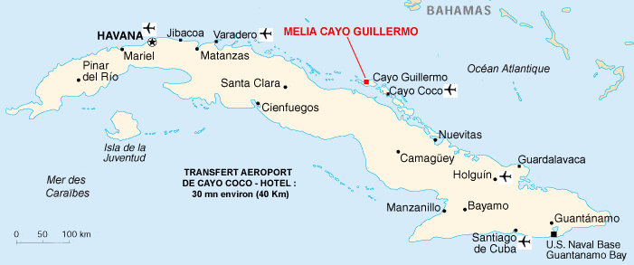 L'hôtel Melia Cayo Guillermo se trouve sur l'îlot de Cayo Guillermo, en bordure d'une superbe plage de sable blanc, la plage de Cayo Guillermo, continue sur 3.7 Km. Transfert aéroport de Cayo Coco - hôtel : environ 30 mn (40 Km).