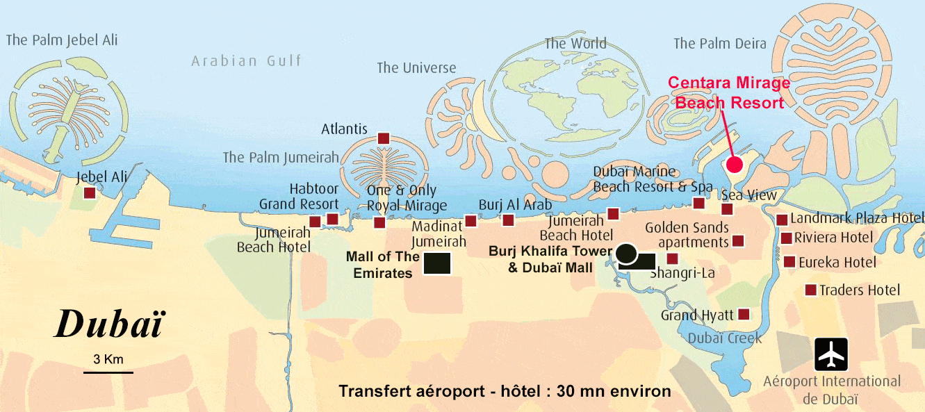 L'hôtel Club Coralia Centara Mirage Beach Resort 4* est situé en face de la vielle ville de Dubaï, sur l'archipel de la palm Deïra à une trentaine de minutes au Nord du centre de Dubaï (tour Khalifa). L'hôtel est mitoyen du RIU Dubaï. L'hôtel est bordé par une belle plage artificielle de sable blanc de 800 mètres de long environ (face aux deux hôtels). Mall of the Emirates & Ski Dubaï : 32 Km (33 mn). Dubaï Mall & Tour Khalifa : 18 Km (23 mn). Transfert aéroport de Dubaï - hôtel : 30 mn environ.