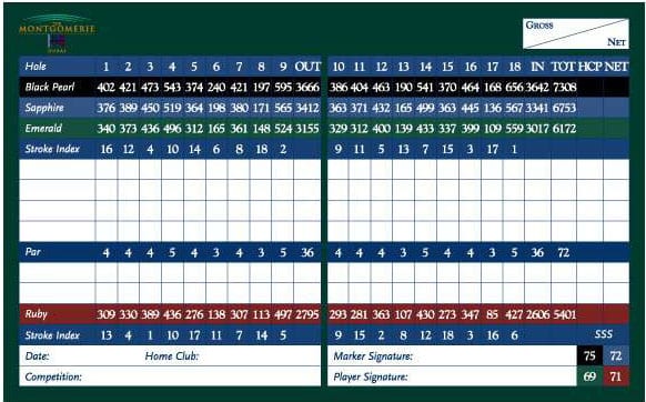 Description : Ce parcours est considéré comme l'un des plus beaux de Dubaï. C'est dans tous les cas, le plus imposant. Situé au coeur du quartier résidentiel d'Emirates Hills à deux pas de l'Emirates Golf Club, le Montgomerie allie le golf de compétition et un hébergement de luxe. Conçu par Montgomerie et géré par Troon Golf, ce parcours de championnat de 18 trous, par 72 offre des paysages splendides dans un carde naturel, signe distinctif des grands parcours mythiques. Il comprend 14 lacs et 72 bunkers sans oublier le plus grand green du monde, d'une superficie de 5400 m². De la taille de neuf greens, le 13ème trou a la forme des Emirats Arabes Unis. Entièrement entouré de plans d'eau, d'une longueur de 182 mètres, ce trou peut être joué depuis un tertre de départ de 360°, présentant ainsi l'avantage d'un trou de golf totalement différent à chaque partie. Le 18ème trou d'une longueur de 600 mètres, appelé le "serpent" en raison de sa forme sinueuse, constitue le trou emblématique de ce parcours. Ce golf comprend un practice éclairé pouvant accueillir plus de 200 golfeurs simultanément ainsi que des parties courtes et des practices et un parcours d'entraînement par 3.